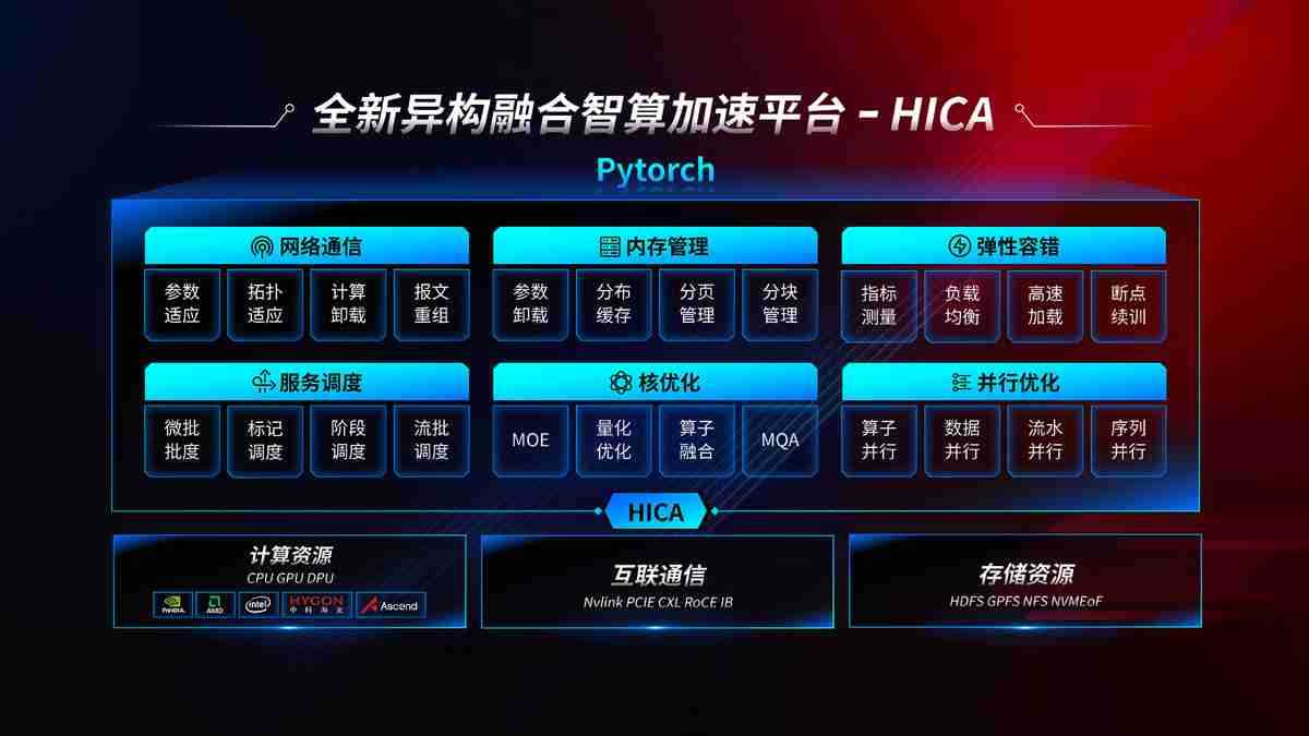 通过自研的服务层、、中间适配层、、以及调度编排算法,,采用数据并行、、、模型并行等多种并行方式,,把并行计算任务进行有效的分解,,,使其分别由相应的软件栈和算力资源来承接。。当GPU资源变化,,,,HICA可以实时动态调度计算子任务并调整模型拓扑和架构,,以充分聚合各种算力资源。。