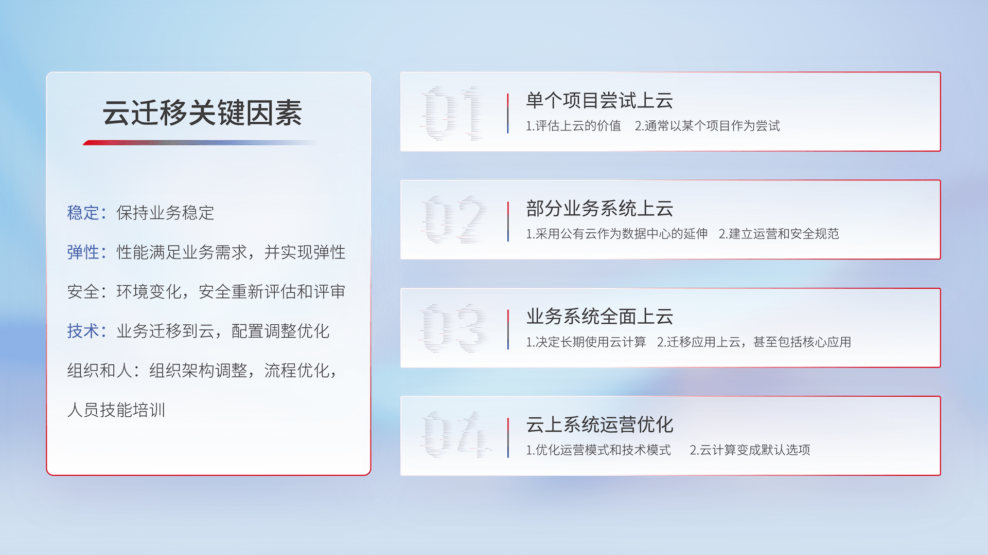 结合实际业务,,,从规划设计、、、云平台选型、、、、云原生改造、、数据迁移、、、、集成交付,,,,迁移全过程为客户识别最佳上云路径,,做好风险识别管理,,,,设计网络架构、、、身份权限、、、安全审计合规、、、、操作审计、、日志审计、、、、监控告警策略、、、多站点容灾设计等,,,,对云上基础设施进行整体规划,,,,提升IT治理水平,,,以满足弹性、、、、高可用、、、高性能的需求。。。。