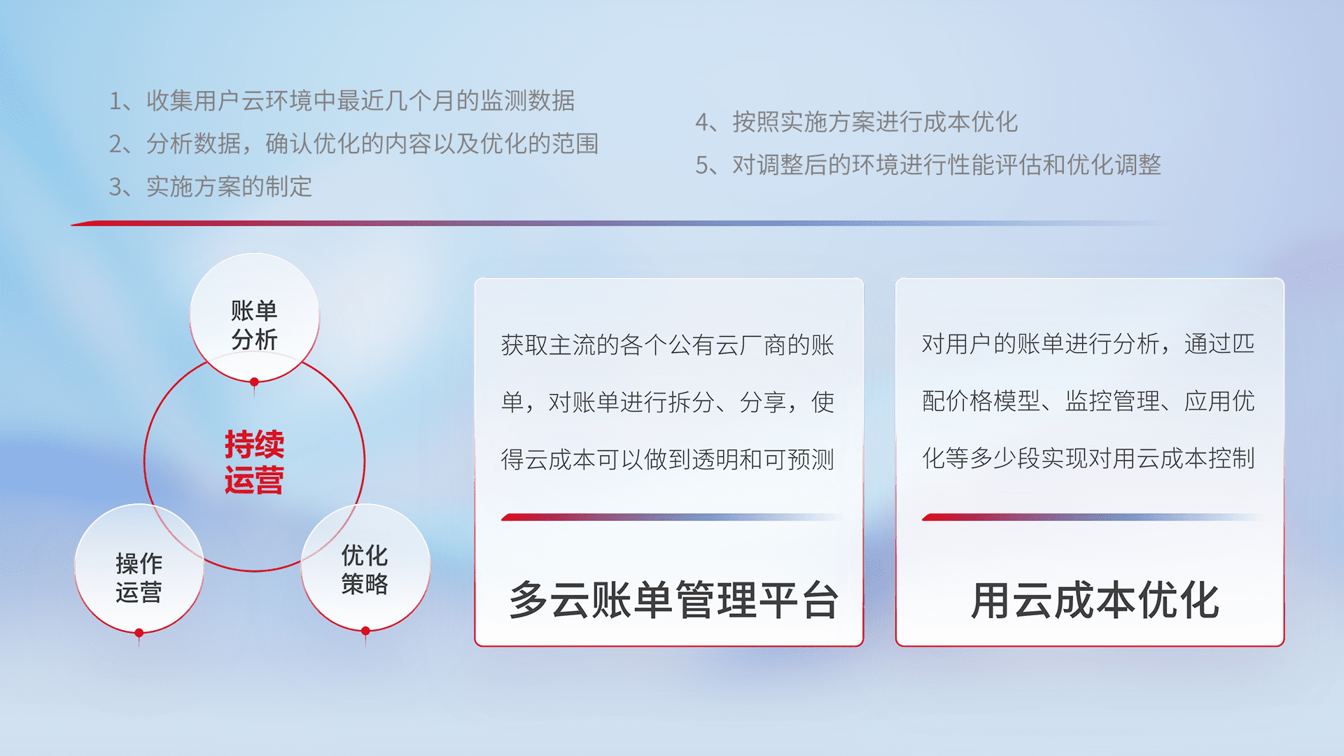 通过多云纳管,,以统一的资源数据模型把客户的云资源进行抽象和封装,,,,进而实现对多云资源的统一操作,,保障云资源管理的可靠性、、、、稳定性与可用性。。。量身定制化运维内容,,,配置、、、开发运维、、、、补丁管理、、、备份、、监控、、认证和访问管理、、、审计和日常巡检等,,,,保障在用云过程中的可靠度,,,稳定度以及高可用率。。